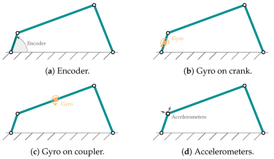 To verify the accuracy of this new algorithm, various sensors and combinations of sensors have been used to determine their influence on the results. The same combinations have been used as in previous works, as detailed in Figure 2. Specifically, for the four-bar linkage, the following sensors have been used: (a) an encoder installed on the crank, coinciding with the degree of freedom of the mechanism, (b) a gyroscope on the crank that measures its angular velocity, (c) a gyroscope in the mechanism coupler and (d) a biaxial accelerometer at the end of the crank with the axes aligned so as to capture the longitudinal and transverse accelerations with respect to it. In the case of the five-bar linkage, the same sensors have been used but duplicated since it has two degrees of freedom. The modeling of the accelerometers and gyroscopic sensors is detailed in [14], and their characteristics are shown in Table 3. These noise levels are compatible with low-cost sensors.