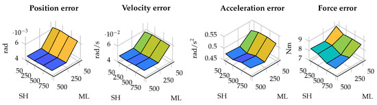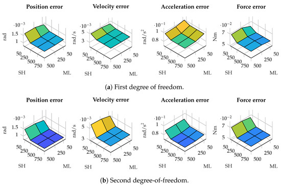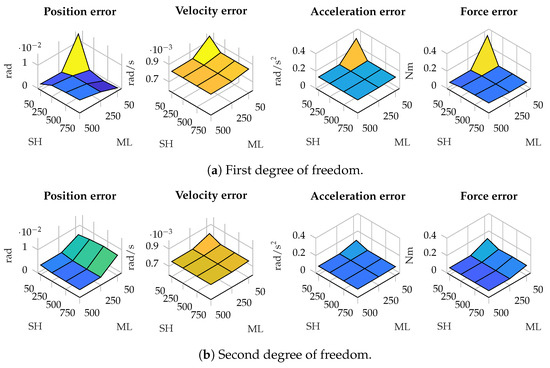 There are scenarios where the window size of the shaping filter has more effect. As an example, Figure 4 presents the error in the estimations in position, velocity, acceleration and force in the five-bar linkage with gyroscopes on the cranks. As can be seen, in the second degree of freedom, the error decreases as the window employed by the maximum-likelihood algorithm increases, while the effect of the size of the window for the shaping filter has less influence. In the first degree-of-freedom, however, the window size of the shaping filter has higher relevance in the accuracy of the estimations: a small window size for the shaping filter, combined with a small window size for the maximum-likelihood algorithm, results in higher errors.
