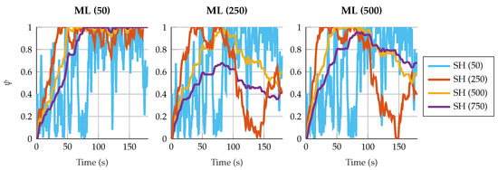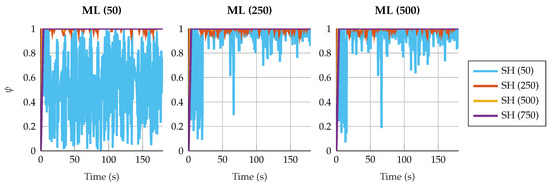 When is properly adjusted, it enables better working of the adaptive algorithm, which assumes that the plant error is white noise. In this work, we studied the autocorrelation of the innovation sequence to set the proper value of . In this case, a sliding window of a fixed size n is considered, and the autocorrelation of the innovation within this window is studied. Since the model in Equation (19) relates the value in one time step with the one in the previous time step, the relevant magnitude here is the autocorrelation with the lag of 1 time step, as follows: