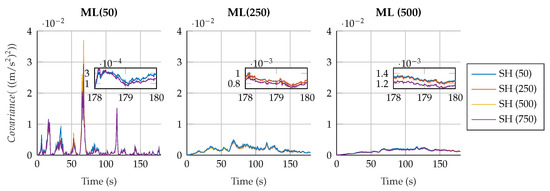where m is the number of measurements in the measurement vector , j the counter of samples inside the sliding window, the determinant operator, and exp the natural base. Note that are the covariances which are being estimated, is the innovation sequence for a window size of N samples, and is the covariance matrix of the residuals of the Kalman filter. After some simplifications [19,27], the maximum likelihood condition can be derived: