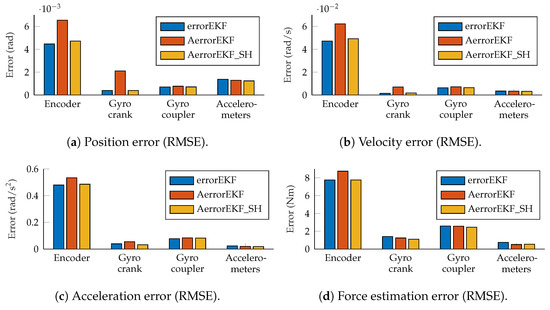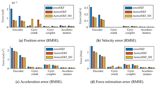 The accuracy of the estimations provided by the AerrorEKF_SH is tested using again the the four-bar and five-bar linkage mechanisms (Figure 1) considering the different set of sensors depicted in Figure 2. The window sizes for the plant noise estimation and estimation are of 500 samples for both algorithms. The tests considered were performed using the three-simulation method, with the conditions explained in Section 2. The tests were performed with simulations of 180 s, but the first 20 s were not taken into account to let the adaptive methods capture the behavior of the mechanism and adapt to it. The root mean squared error (RMSE) of the test with the four-bar linkage is shown in Figure 10.