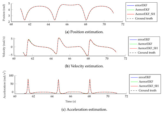 The estimation accuracy of the kinematic magnitudes is quite high for all the methods and with all the sensors for most applications. The worst estimation is achieved with the encoder, and even in this case, the accuracy of the estimation at position level is better than that of the encoder itself due to the added noise, and thanks to the estimator, accurate estimations of velocity and acceleration are also achievable with only this position sensor. The results from the other sensors considered are better than those of the encoder, and even position estimation is possible for the maneuvers tested using only one angular rate sensor (gyroscope or gyro) on the crank or on the coupler, or a pair of accelerometers on the crank. Position, velocity and acceleration estimations using only the encoder are shown in Figure 11. It can be seen that even with this sensor, which provides the worst estimation accuracy, the estimations are almost indistinguishable from the reference signals.