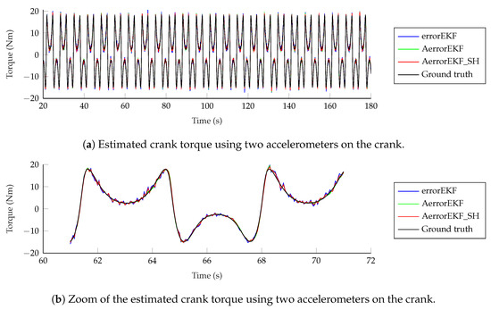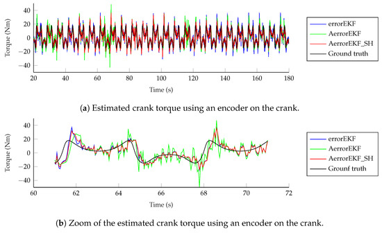However, the situation with force estimations is worse. Force estimations achieved with the encoder can be seen in Figure 12. In the upper plot in this figure, the estimation from 20 to 180 s is shown. In the lower plot, just 10 s are shown for the sake of clarity. The three methods behave similarly, with a low-accuracy estimation, and with a noticeable delay when sudden changes in force are required. At this point, it is worth pointing out that there is not actually any torque applied to the crank of the mechanism, but there is a wrong value of the gravity acceleration applied to the mechanism with errors. Since this difference is introduced as a modeling error which is supposedly unknown, the estimator tries to correct it by applying a force on the degrees of freedom which compensates the acceleration error. In this case, since the degree of freedom is an angle, the force is actually a variable torque which aims to compensate for the effect of the gravity error. The reference line provided here is the torque that should be applied to the crank of the model with errors to have the same acceleration as the reference model when both models have the same position and velocity. In other problems, where the designer might know where the error comes from, the method can be modified to apply the correction force in a more realistic way, as shown in [7], where a vehicle is studied, and the correction forces are applied to the tires, instead of being applied to the degrees of freedom. Going back to the plots in Figure 12, it can be seen that the force estimation is not accurate, especially when the force presents a fast change in value, where the estimation acts with a noticeable delay.
