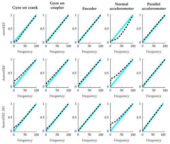 Finally, as an indicator that the estimators are working properly, the sequence of the innovation should resemble white noise, and therefore, the periodogram of the innovation sequence should be a straight line. This information was used to tune the errorEKF by hand, and it is also used to check that the adaptive methods are working properly. The results of all the maneuvers performed with the four-bar linkage are shown in Figure 14. All the methods approximate a straight line quite well, with the exception of the normal accelerometer (the accelerometer installed perpendicular to the crank), whose innovation periodogram is the worst. The trends of the periodograms are very similar for both adaptive methods, but the method with the shaping filter is closer to a straight line in all cases. It is worth pointing out that the plant noise for the errorEKF is constant and it is the same for all the maneuvers, while the adaptive methods vary the plant noise continuously, and thus, it is not constant even within every single test.