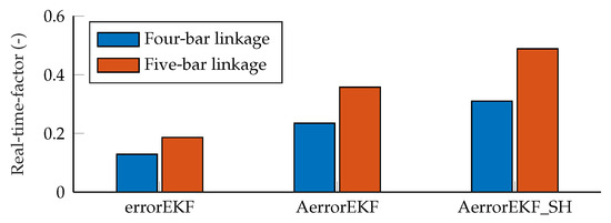Regarding the computational cost, a comparison of the different algorithms is shown in Figure 16. However, it must be pointed out that the implementation used in this work was performed in Matlab, whose main focus is not efficiency, and also, the MBDE library used is not intended for efficiency but for flexibility and fast development of new methods. Therefore, the data of computational cost must be taken just as a worst-case scenario. A dedicated program in Matlab might be about twice as fast, and the difference would be greater if a compiled language, such as C++, were used instead. That said, in this case, it can be seen that the increase in computational cost of the five-bar tests with respect to the four-bar ones is 44% for errorEKF, 52% for AerrorEKF, and 57% for AerrorEKF_SH.