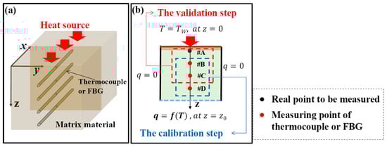 (a) Schematic diagram of the sensors (thermocouple or FBG) embedded in the TPS, and (b) illustrative diagram of the surface temperature estimation by the TIM-AB method.