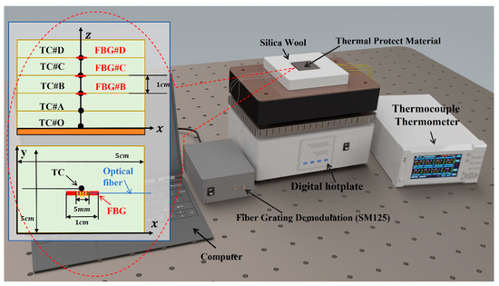 The experimental equipment for the lateral heating of thermal insulation material is shown in Figure 2. The bottom of the thermal insulation material was heated by a digital heating hotplate. The upper surface was set to natural convection. The other sides were wrapped by a heat-insulating silica wool to form an adiabatic condition. The size of thermal insulation material was 5 cm × 5 cm × 5 cm. The temperatures at points #A, #B, #C, and #D inside the material were measured by thermocouple (TC) and fiber Bragg grating (FBG) sensors, as illustrated in Figure 2. The K-type thermocouple had a probe size of ~0.3 mm and a response delay of ~100 ms. Each FBG was encapsulated and protected in a 0.5 mm diameter corundum tube. Point #O is located at the contact surface between the material and the hotplate. Due to the complexity and instability of the heat transfer mechanism of the contact surface, the temperature at point #O that indicates the bottom temperature was monitored by a TC.