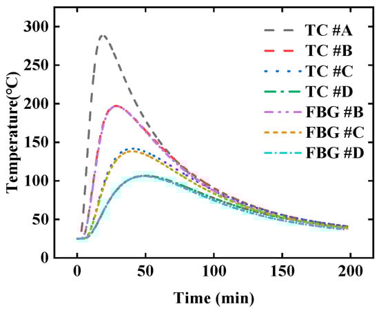 The temperature at point #A was selected as the target of the inversion, and the temperature at points of #B, #C, and #D were the input data of the inversion. The comparison of the temperature measured by TC and FBG is shown in Figure 3. The temperature measurement results of FBG and TC have little deviation. If it is only for measuring the internal temperature of the material, the temperature deviation of the two sensors can be ignored.