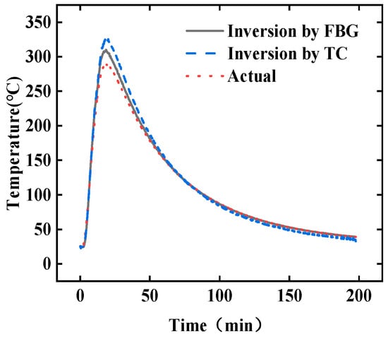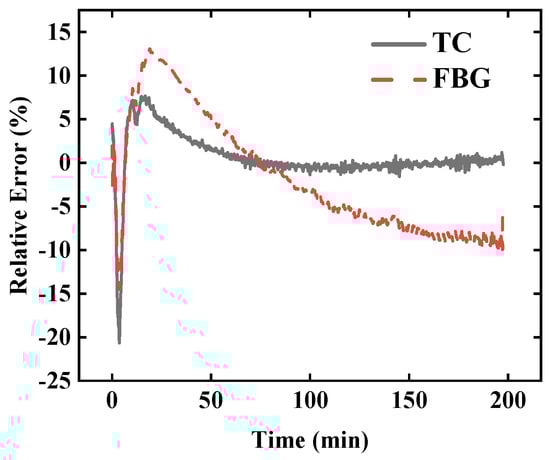 Based on the FBG data and the TC data respectively, the inversion temperature at point #A calculated by the TIM-AB method is as shown in Figure 4, and the relative error of the inversion temperature is shown in Figure 5. The temperature measured by the TC is taken as the actual reading at point #A. The mean relative error for the TC data is less than 1.6%, whereas the mean relative error for FBG data is less than 6.2%. Both measurement tools ensure the high accuracy of the algorithm the error based on TC is smaller. If the inversion accuracy based on FBG is to be improved, the thermal hysteresis correction algorithm of the tube-packaged FBG sensor can be used, as detailed in Ref. [39].
