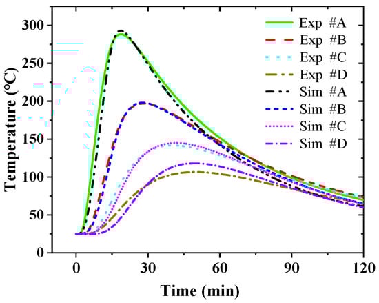 The simulated results of the temperature at points #A, #B, #C, and #D were compared to those measured by the TC, as shown in Figure 7. The results show that the numerical simulation results are basically consistent with the experimental results. Although the heat transfer mechanism inside the thermal insulation material is very complex, the heat transfer process can be simplified to the classical Fourier heat transfer process under the long-term loading of small heat flow. Therefore, the temperature evolution under Gaussian pulse thermal shock was analyzed by numerical simulation, and then the effect of the window size on the accuracy of real-time inversion was analyzed.