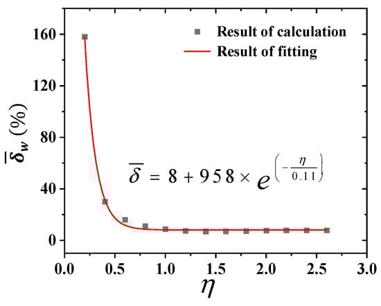 In numerical simulation, the Gaussian pulse thermal shock , . q0 is the peak power density, 1 W/cm2. ZAB is the distance between points #A and #B. ZBC is the distance between points #B and #C. Figure 8 presents the inversion temperature responses at point #A for differently adopted window sizes, . The sampling frequency fs is 100 Hz. When the window size coefficient η is less than 0.4, it is completely impossible to calculate the temperature at point #A through the inversion method, and the inversion results have no correlation with the actual results. In this case, the duration of the measurement is very short, much shorter than the thermal hysteresis time. The thermocouple (point #B) closest to the heat source cannot effectively detect the changes in the external thermal load. The thermocouples (points #C and #D) far from the heat source are even less capable of obtaining valid information. Therefore, it is difficult to invert the external temperature from the internal temperature data. When η is greater than 0.6, the inversion results closely approximate the actual results. Figure 9 shows the relationship between the mean relative error of the inversion results and η. When η = 0.2, is close to 160%. When η = 0.4, quickly drops to 30%, and when η = 1, gradually stabilizes to about 8%. decreases exponentially with the increase in η. The fitted exponential function is .