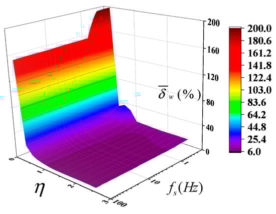 Figure 10 presents the mean relative error of the inversion results at different window sizes and sampling frequencies. is basically exponential with η at different sampling frequencies fs. When fs is less than 1 Hz, becomes significantly larger. At η = 0.2, reaches 200%. Furthermore, the relationship between and η deviates from an ideal exponential curve, displaying oscillatory behavior at η = 1. When η reaches 1.6, converges to a constant value of ~10%. When fs exceeds 1 Hz, consistently follows an exponential relationship with η. Even when fs increases from 1 Hz to 100 Hz, the maximum mean relative error only shifts from 158% to 156%, and the minimum decreases from 7.8% to 6.4%. Therefore, is highly sensitive to variations in η but remains relatively insensitive to the sampling frequency during inversion calculations.