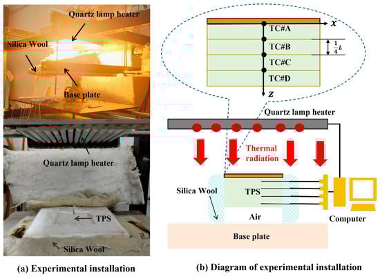 The experimental setup for the thermal characterization of the TPS is as shown in Figure 11. The setup mainly comprised a quartz lamp, base plate, heat insulation cotton, and data acquisition and processing. The upper surface of the TPS serves as the radiation surface, while the lower surface subjects to natural convection. A natural convection environment was established by elevating the TPS, thereby enabling the lower surface to be fully exposed to the air. With the exception of the top and bottom surfaces, the remaining sides of the TPS were encapsulated with heat-insulating silica wool, ensuring an approximately adiabatic condition. Inside the TPS sample, a set of TC was arranged along the z-axis (See Figure 11b). The K-type TC had a probe size of ~0.5 mm and a response delay of ~250 ms. The thermocouple sampling frequency was 10 Hz. The four thermocouples at #A, #B, #C, and #D were equidistant. The effective thickness of the material was L, and the distance between the two measuring points was L/4.