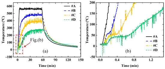 The temperature variation curves of points #A, #B, #C, and #D under quartz lamp heating, (a) the temperature of the entire heating process, (b) the temperature at the initial moment of heating.