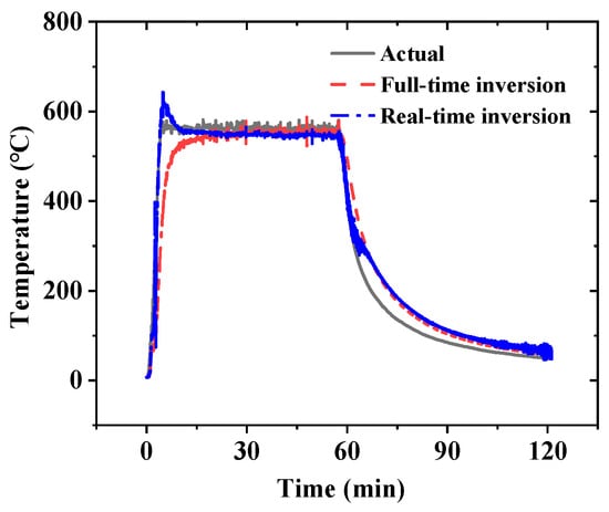 Without noise filtering, the temperature at point #A was calculated using both the full-time inversion method and the real-time inversion method. The comparison between the inversion temperatures from these two methods and the true temperature at point #A is shown in Figure 13. The real-time inversion method used a window size of η = 1. The results demonstrate that, under real test conditions, the real-time inversion method effectively calculates the material’s surface temperature in real time. Compared to the full-time domain inversion results, the real-time inversion exhibits overshoot during the instantaneous temperature rise phase. In full-time domain inversion, this phenomenon may also occur if the sensor collects insufficient data during the instantaneous temperature rise, leading to an unclear temperature transfer relationship between measurement points [39]. During the temperature-holding phase, the results from the full-time domain inversion are closer to the true values. In the first half of the cooling phase, the results from the real-time inversion method are closer to the true values. In the second half of the cooling phase, the full-time inversion method has a slightly higher accuracy than the real-time inversion method. Overall, the mean relative error of the results from the full-time domain inversion method is approximately 15.7%. The results calculated using the real-time inversion method contain more noise, with a mean relative error of about 18.8%.