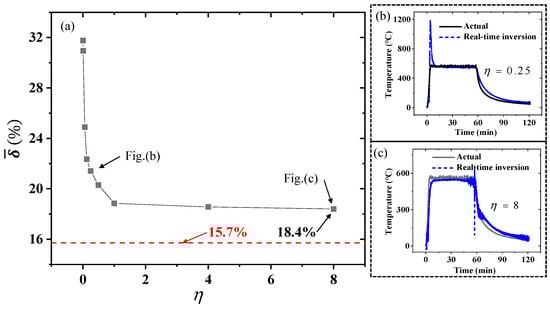 The accuracy of the real-time inversion method using different window sizes. (a) The relationship between the mean relative error and the window size coefficient η; (b) the comparison of real-time inversion temperature and real temperature, when η is 0.25; and (c) the comparison of real-time inversion temperature and real temperature, when η is 8.