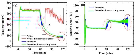 Figure 15a displays four temperature profiles about point #A: the actual temperature; the modified temperature with random errors (actual and uncertainty error); the inversion temperature using the original data from #B, #C, and #D; and the inversion temperature using error-containing data. Figure 15b compares the relative errors between inversions using actual data versus error-containing data. The results demonstrate that measurement uncertainties affect inversion accuracy, particularly during the initial cooling phase and the temperature stabilization phase. While measurement errors amplified inversion errors during cooling, they exhibited error-reducing effects during temperature stabilization. Statistical analysis reveals the mean relative error increased from 18.8% (using actual data) to 20.6% when accounting for measurement uncertainties.