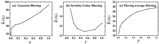 The effects of three typical noise filtering methods, Gaussian noise filtering, Savitzky-Golay noise filtering, and moving average noise filtering, are shown in Figure 16. The window size coefficient η = 1 was used for the real-time inversion. Figure 16a shows the effect of Gaussian noise filtering. α represents the ratio of nG to the window size for real-time inversion. nG is the number of non-zero points. nG = 1 indicates no noise filtering. As α increases, the mean relative error of the inversion temperature increases monotonically. Figure 16b shows the effect of Savitzky-Golay noise filtering. The polynomial order was set to 3. γ represents the ratio of the window size for Savitzky-Golay noise filtering to the window size for real-time inversion. As γ increases, first decreases and then increases. is minimized when γ = 0.5. Figure 16c shows the results of moving average noise filtering. β represents the ratio of the window size for moving average noise filtering to the window size for real-time inversion. gradually increases as β increases.
