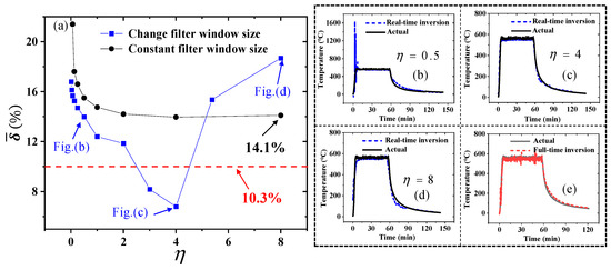 (a) Under two window size settings of Savity–Golay filtering, the mean relative error varies with the window size of real-time inversion; (b) the comparison of the inversion temperature with the true temperature, when η = 0.5; (c) the comparison of the inversion temperature with the true temperature, η = 4; (d) the comparison of the inversion temperature with the true temperature, η = 8; and (e) the temperature calculated by full-time domain inversion method based on the denoised global data.
