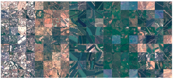 This dataset [37] encompasses a comprehensive collection of 27,000 labeled images of size 64 × 64 pixels images. The images are georeferenced and meticulously categorized into ten distinct classes representing various land use and land cover types. Each class contains somewhere between 2000 and 3000 images. Samples are shown in Figure 2. The combination of multispectral data and precise geospatial referencing provides an unprecedented opportunity for researchers to develop and evaluate robust classification models. The ten classes are the following: industrial buildings, residential buildings, annual crop, permanent crop, river, sea and lake, herbaceous vegetation, highway, pasture, and forest.