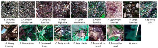 The classification scheme used in this dataset consists of 17 classes: 10 built classes, and 7 natural classes. These classifications are based on climate-relevant surface properties at a local scale, including 3D surface structures (e.g., building and tree height and density), surface cover (e.g., vegetation or paving), and anthropogenic factors (e.g., human-induced heat emissions). Samples are shown in Figure 3. The selected 42 urban agglomerations and 10 smaller regions span all inhabited continents, excluding Antarctica.
