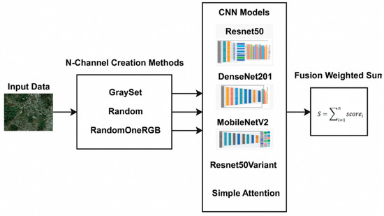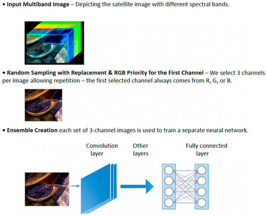 The concept of EL is grounded in a straightforward principle: combining multiple models can lead to improved and more reliable results. Ensembles are most effective when the individual models exhibit significant diversity [52]. In this study, we construct ensembles by employing different techniques to represent input images as three-channel images or as multiband images. As illustrated in Figure 4, starting from the original multiband input image, we create different three-channel and multichannel images: