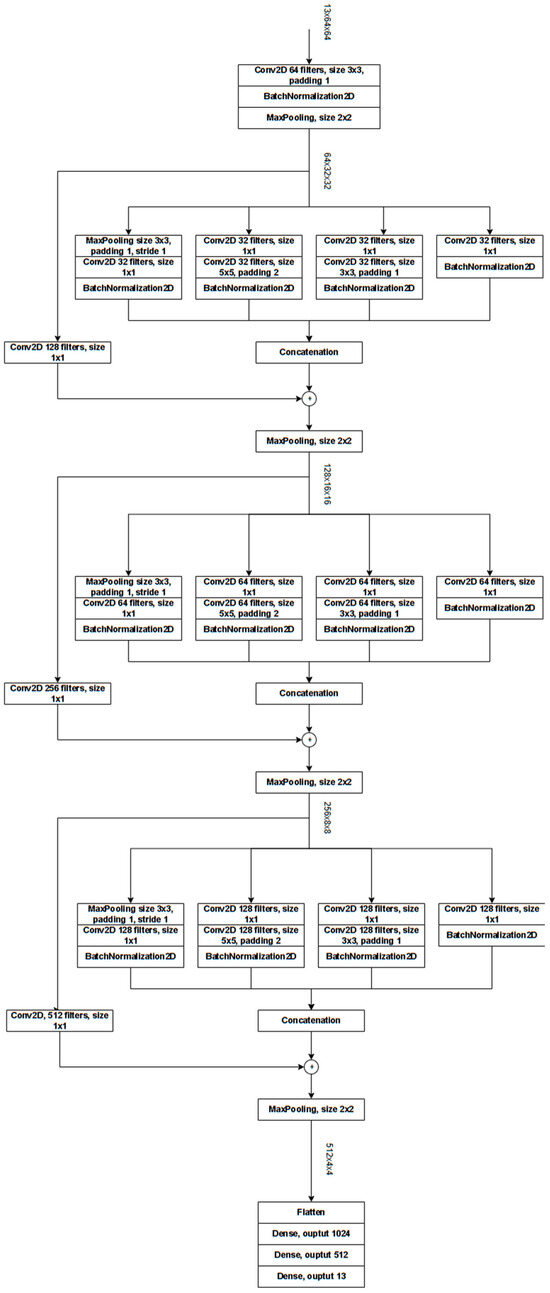 Within each macroblock, the Inception Block replicates the branch structure detailed in the original paper by employing different combinations of small convolutional filters to extract diverse features. With four branches, each convolutional layer in a branch uses one-fourth of the filters allocated for the final Inception output. The branch outputs are concatenated and then combined with a 1 × 1 convolution of the Residual Block’s input to ensure matching dimensions. The 1 × 1 convolution is crucial for aligning the original input with the new output shape. While the number of channels doubles at each stage, the spatial dimensions remain constant within each block; 2 × 2 max pooling is applied after each block to progressively reduce height and width. All convolutional and dense layers use the ReLU activation function, and every convolutional layer (except for the 1 × 1 convolution in the Residual Block) is followed by a Batch Normalization layer.