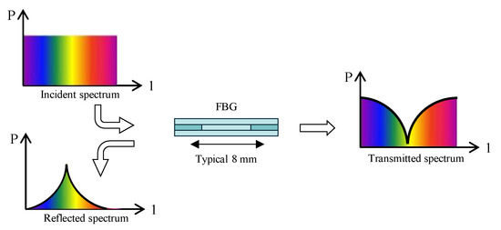 At each spatial periodicity of the refractive index change, a small portion of the light undergoes reflection. When the grating period is approximately half of the incident light’s wavelength, all reflected light coherently combines into a beam with a specific wavelength, resulting in a large reflection. This is known as the Bragg condition. The wavelength at which the incident light undergoes reflection is called the Bragg wavelength. The light of the other wavelengths is almost unaffected by the Bragg grating and will continue to transmit through the optical fiber grating. For an illustration of this principle, please refer to Figure 1.