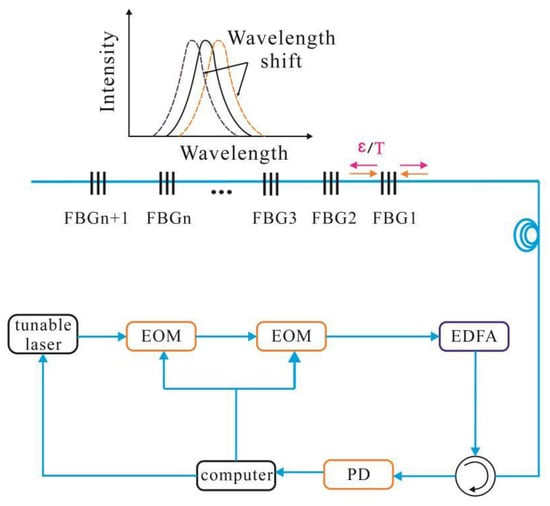 Signal demodulation is achieved using a tunable laser, electro-optic modulator, and erbium-doped fiber amplifier, with reflected light collected by a photodetector. Shifts in the reflected wavelength indicate changes in strain or temperature, with temperature compensation ensuring accurate strain measurements [21,22].