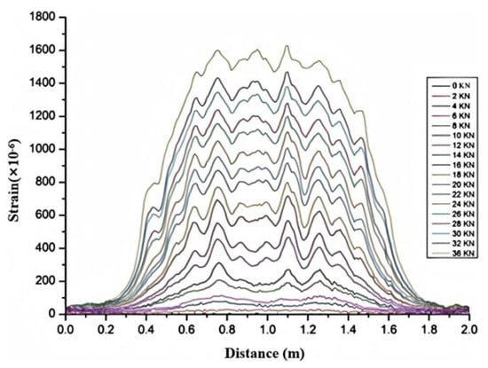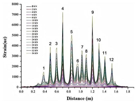 As shown in Figure 8, the strain peak generated by the steel strand cable is not obvious, but the location of the crack can still be detected, and the strain peak range of the crack is larger. Before 36 kN, about 1600 micro-strains were generated, and the maximum crack was 0.23 mm. This shows that due to the large elastic modulus of the steel strand cable, its strain isolation is also relatively large. When the crack width expands to 0.23 mm, the adjacent cracks cannot be identified.