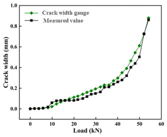 As the load increases, the crack width shows a significant nonlinear trend. Initially (0–10 kN), the crack width increases slowly, but beyond approximately 20 kN, the rate of increase accelerates, especially above 50 kN, where the crack width grows sharply (Figure 9). This indicates that the structure primarily exhibits elastic deformation at lower loads, while plastic deformation or crack propagation may occur at higher loads. Therefore, monitoring should be intensified above 20 kN, and loads exceeding 50 kN should be considered as a warning threshold, requiring prompt action to prevent structural instability or failure. The strain level of the high-strength strain optical cable corresponding to a load of 20 kN is 800 microstrain, which provides a basis for the subsequent health evaluation of the ground-connected wall.