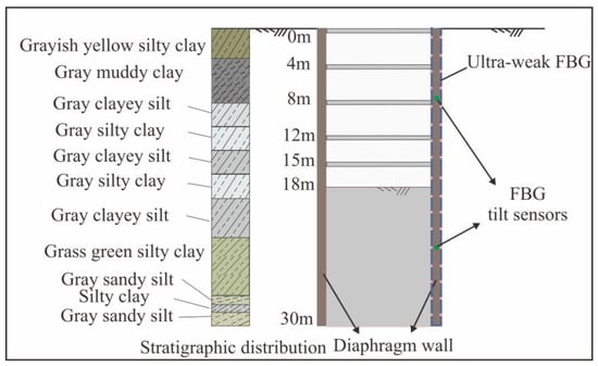 The study area is located in Baoshan District, Shanghai, and the Yangtze River south road section of Shanghai Metro line 18 is to be built. The survey revealed that the foundation soil of the station is within the depth of 75.0 m, all of which are loose Quaternary sediments, belonging to the Quaternary coastal, estuary, shallow sea, swamp, drowned valley, and lacustrine facies sedimentary layers, mainly composed of saturated sediments. It is composed of cohesive soil, silty soil, and sandy soil and generally has the characteristics of layered distribution. Figure 10 shows the mechanical parameters of the soil. The CX7 optical fiber monitoring point in the foundation pit was introduced. The depth of the diaphragm wall is 30 m, and the estimated excavation depth is 18 m. Five concrete struts are presented. Based on the empirical analysis, the tilt sensor installation points were selected as 7 m and 25 m.
