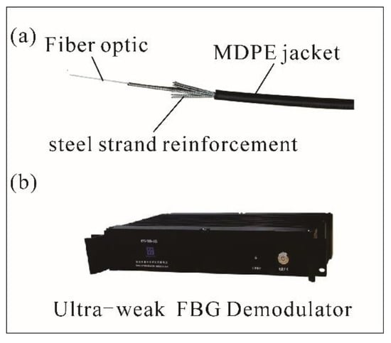 As shown in Figure 11a, the high-strength strain optical cable used in this project has good mechanical properties and tensile and compressive properties and can be well coupled with rock, soil, concrete, and other structures (the same model as used in indoor tests). The construction is convenient, and, at the same time, it can resist all kinds of bad working conditions. The demodulator can collect thousands of points simultaneously, and the system integration is high. Figure 11b shows the figure of demodulation equipment.