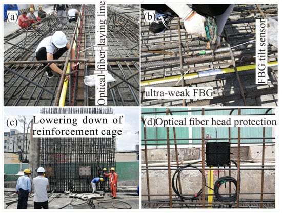 In the process of processing the reinforcement cage of the diaphragm wall, the optical cable laying line is determined (Figure 12a), and the ultra-weak FBG and tilt sensor are bound at the design position of the reinforcement cage (Figure 12b). When selecting the layout position, it is necessary to avoid welding, oxygen cutting, and conduit cabin, which are easy to damage the optical cable. In the process of lowering the reinforcement cage, the construction personnel guard the whole process to prevent the reinforcement cage from being damaged in the process of lowering (Figure 12c). Finally, the top head of the diaphragm wall is protected, and the initial value is obtained by using a portable optical fiber demodulator (Figure 12d).