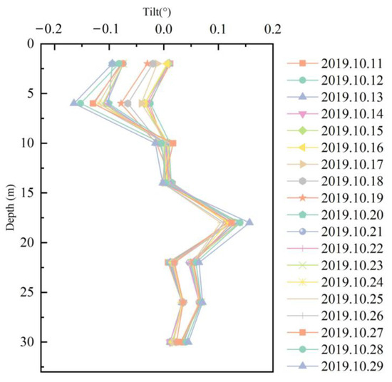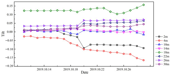As shown in Figure 14, the time-series data of angular displacement for the diaphragm wall reveal a gradual increase in deformation over time, corresponding to the progressive excavation and increasing soil pressure. This is followed by a phase of stabilization, indicating that the wall has reached an equilibrium state in response to the excavation. However, short-term fluctuations in displacement are observed, likely due to transient factors such as groundwater variations or temporary construction disturbances. Notably, abrupt peaks in displacement may indicate sudden load changes or localized structural responses. These deformation patterns, when correlated with key excavation milestones, provide critical insights into the dynamic soil–structure interaction and highlight the importance of continuous monitoring to assess stability and optimize construction practices.
