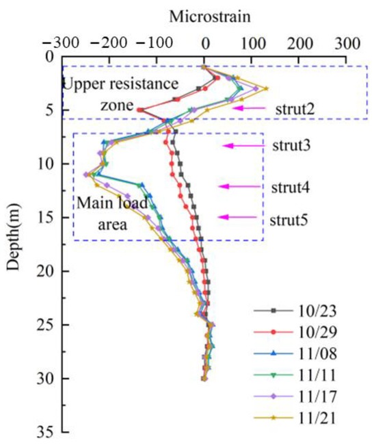 As shown in Figure 15, the strain distribution outside the diaphragm wall was positive–negative. At the initial stage of excavation, because the top strut of the diaphragm wall has not been formed, the strain of the diaphragm wall is negative. When the top strut can provide a certain support reaction, the upper strain of the diaphragm wall is positive, and the lower strain is negative. Therefore, according to the strain characteristics, the diaphragm wall was divided into different areas (Figure 15): upper resistance area (URA) and main load area (MLA). For the upper resistance zone, the strain changes from negative to positive with the increase in excavation depth. Furthermore, stress concentration shows in the upper part of the second strut. For the main load area, the deformation increased with the progress of excavation, and the strain peak appeared at a depth of 11 m. When the excavation depth increases, the struts have limited influence, and the local strain peak appears. The horizontal displacement of the middle part of the wall was triggered by the active earth pressure, while the upper support and the soil below the excavation face hindered the wall movement. Based on the experimental analysis of the beam structure, it is known that when the strain level measured by the optical cable reaches an 800 microstrain, it is necessary to focus on the analysis of the obvious cracks that may occur in the structure. Based on the on-site monitoring data, it can be seen that the maximum strain of the underground continuous wall is less than a 300 microstrain, so there may be certain tiny cracks in the structure, but the overall structure still maintains a linear deformation stage and can provide good support.