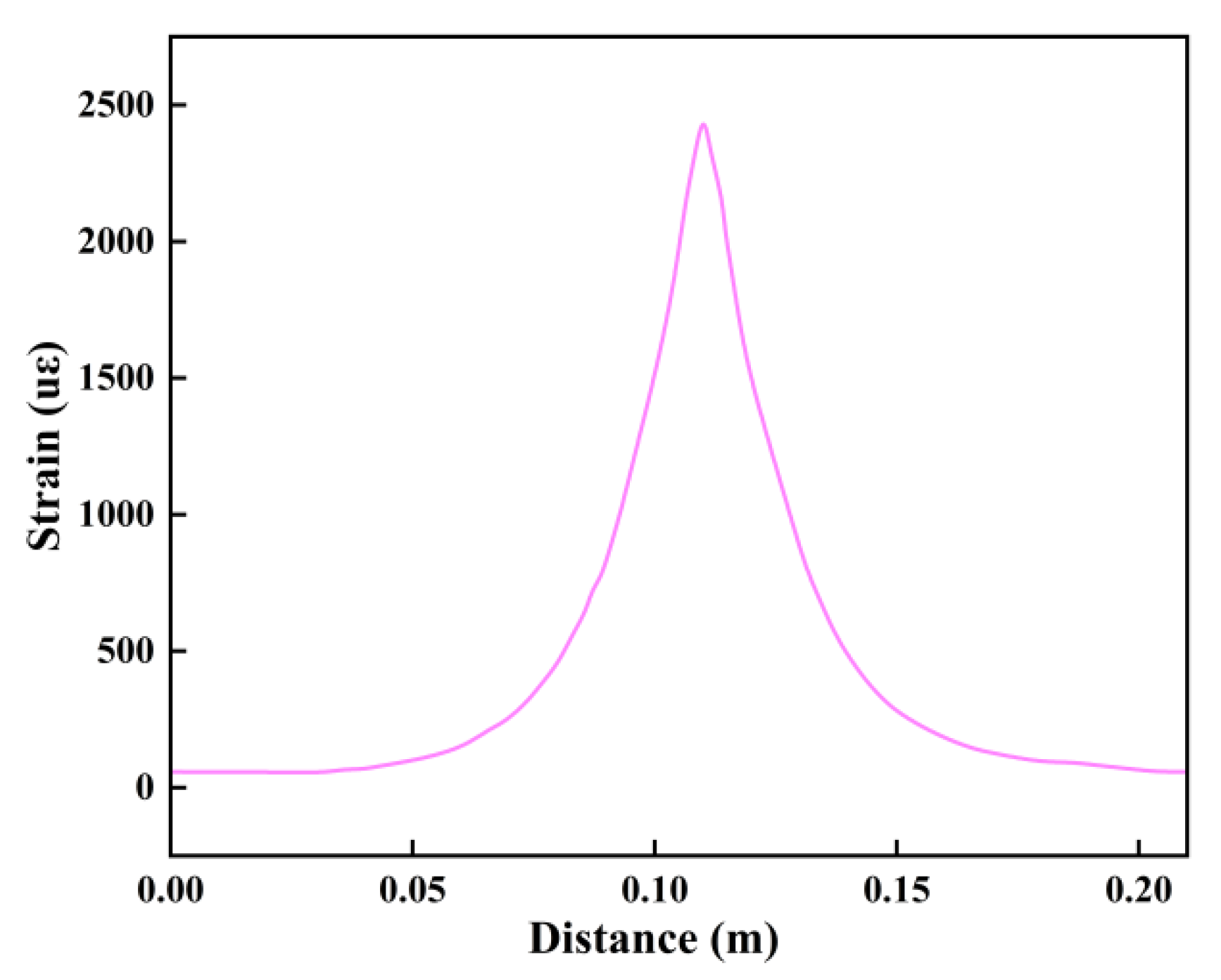 The strain peak can be regarded as a sign of crack generation (Figure 5). The peak point of this strain peak represents the location where the crack is generated. The width of this crack can be obtained by integrating the strain peak.