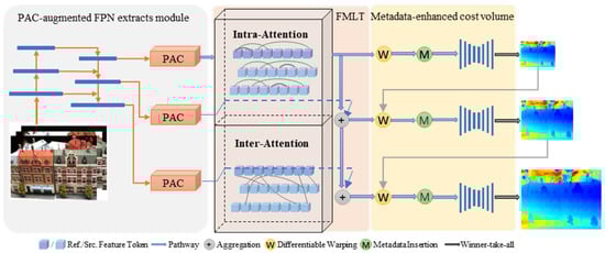 Our PAC-MVSNet initially utilizes the Feature Pyramid Network (FPN) [] to capture multi-scale depth image characteristics across three distinct resolution tiers, spanning from rough to precise. Prior to introducing these features into Transformer, we refine the local feature capture and guarantee a seamless handoff to the Transformer using the PAC module. To harness the comprehensive contextual insights both within and between the reference and source visuals, we leveraged a FMLT module for intra-focus and inter-focus attention mechanisms. To effectively disseminate the transformed traits from lower to higher resolutions and facilitate the FMLT module’s training with gradients across all scales, we integrate all resolutions via the feature pathway.