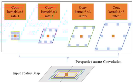 Our goal was to capture diverse features at varying scales along each line of perspective using the PAC module. To maintain standard functionality, we incorporated a branch armed with a conventional 3 × 3 kernel within the PAC module. This strategic decision ensures that the regular feature map remains intact as it traverses through our module. The PAC kernel dynamically skews its shape based on the viewing angle  (Equation (4)). Parallel branches with dilation rates {1,3,5,7} aggregate multi-scale features along perspective lines (Figure 3). This anisotropic design bridges local FPN features and global Transformer contexts.