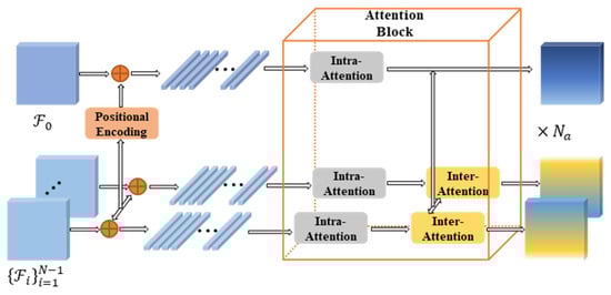 The Transformer-based matching method mentioned earlier handles the feature matching problem between two views. In view of the characteristics of the one-to-many matching task of MVS, we propose a FMLT approach specially customized for MVS. The structural layout of the FMLT module is illustrated in Figure 4, where positional encoding is applied to all feature maps, subsequently flattening them along these spatial dimensions. Subsequently, these attention blocks intervene and exercise intra-attention as well as inter-attention on the features.