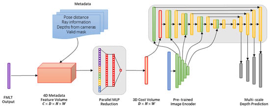 In Figure 5, we present a depth estimation encoder–decoder architecture that integrates a cost volume, with our key innovation being the incorporation of readily available metadata into the feature volume. Each cell in this volume is then efficiently processed using an MLP to transform it into a feature map, which is subsequently input into a 2D encoder–decoder network. Our image encoder was designed to extract pertinent features from both the reference and source images, which are then utilized to populate the input cost volumes. Following this, a 2D convolutional encoder–decoder network is employed to handle the cost volume’s output, bolstered by image-level features derived from a distinct, pre-trained image encoder.