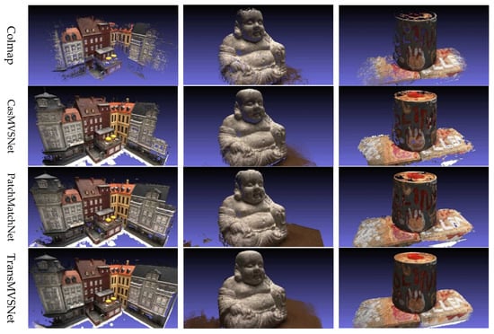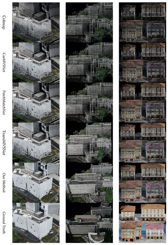 As shown in Table 4, our quantitative analysis revealed that among the evaluated methods, PAC-MVSNet consistently stood out in terms of point cloud quality. It achieved a superior performance across multiple evaluation metrics, including precision, recall, and overall fidelity. Notably, PAC-MVSNet excelled in preserving fine-grained structures and capturing intricate details, which is crucial for accurate urban scene reconstructions. When compared to the other state-of-the-art methods, PAC-MVSNet demonstrated a clear advantage. For instance, while Colmap and CasMVSNet produced reasonably dense point clouds, they often lacked the necessary detail and accuracy in complex urban environments. On the other hand, PatchMatchNet and TransMVSNet struggled with completeness, particularly in regions with repetitive patterns or limited texture. PAC-MVSNet, however, effectively balanced density, detail, and completeness, resulting in high-quality reconstructions.