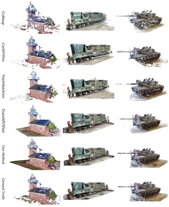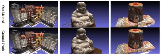 The Tanks and Temples dataset [] was obtained under random conditions in the real world, with no restrictions on lighting conditions or camera positions, and is considered a challenging benchmark in public 3D reconstruction datasets. This dataset emphasizes the high-quality reconstruction of large scenes with complex geometries and varying textures. Therefore, it provides a sufficient testing environment for depth estimation, surface reconstruction, and texture mapping, allowing for the evaluation of our method’s performance.