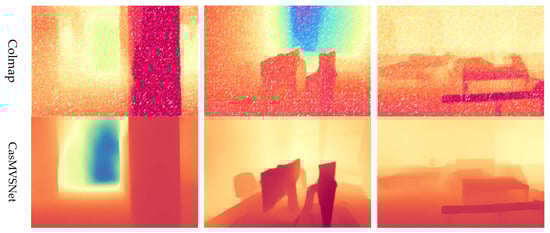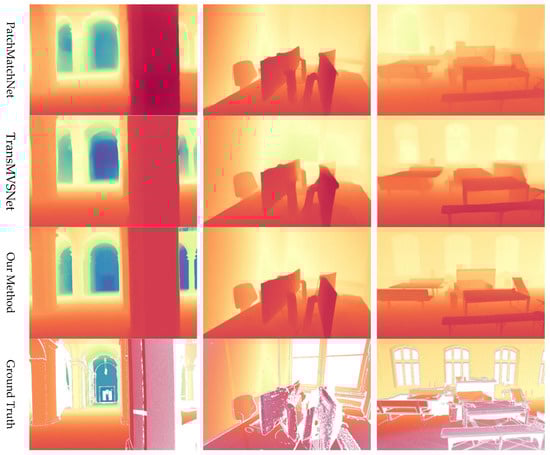 Multi-view stereo (MVS) strives to reconstruct a dense three-dimensional model by utilizing a set of calibrated images, making it a crucial endeavor in the field of computer vision. Learning-driven MVS networks [,,] have made notable advancements in terms of both the quality and efficiency of reconstruction. Commonly, these MVS networks typically employ convolutional neural networks (CNNs) to extract relevant image features and construct a cost volume through the application of the plane-sweeping algorithm []. Within this process, the source image undergoes warping to align with the reference view, and the subsequent regularization of the cost volume facilitates the estimation of the ultimate depth []. Learning-based MVS methods generally include steps such as feature extraction, cost volume construction, and cost volume regularization [], and numerous efforts have been devoted to obtaining superior cost volume and visibility information []. The objective of cost volume regularization is to rectify the noise contamination within the cost volume that arises from non-Lambertian surfaces or the occlusion of objects, thereby smoothing out feature correlations.