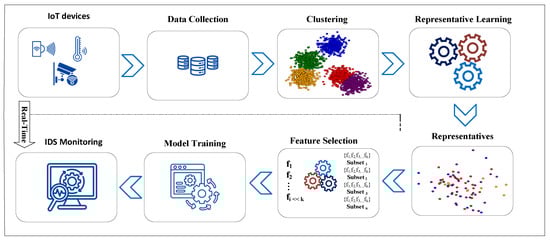 Effectively handling large-scale datasets and managing the resource constraints of IoT environments remains a critical challenge in designing efficient lightweight IDS solutions. Several approaches have been introduced to address the challenges associated with handling large-scale datasets and managing the inherent resource constraints of IoT environments. These methods mainly focus on optimizing data processing to ensure a balance between reducing the size of the training data and maintaining their diversity and representativeness, which is crucial, along with selecting relevant features that optimize detection accuracy [10,11,12]. Several sampling techniques, including random sampling and cluster-based sampling, have been proposed to tackle this issue to select representative observations for training, which ensures the behavioral diversity of the dataset is well captured. Sampling techniques [13,14], such as random sampling and cluster-based sampling, have been introduced to reduce data size. For instance, Meng et al. [13] proposed a random sampling technique based on interval timing for collecting wireless sensor network packets. While this method helps in reducing the volume of data used for training and decreases the computational load on IDSs, it has the limitation of potentially missing critical behaviors, leading to difficulties in detecting unobserved abnormal behaviors. Similarly, Hajj et al. [14] proposed a cluster-based sampling method using k-means to group the data generated by each IoT device into clusters. The centroid of each cluster is used to represent normal observations, while the most distant observation from the centroid within a normal cluster is flagged as abnormal. However, relying on centroids to represent normal and abnormal behaviors may fail to capture the full complexity and diversity of the data within the clusters. These limitations highlight the need for more advanced techniques that can more comprehensively represent the diversity of behaviors in IoT systems, ensuring that even subtle or rare patterns are not overlooked.
