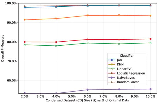 In this section, we present a comprehensive evaluation to assess how effectively the condensed dataset retains the essential characteristics of the original dataset using three distinct datasets (described in Section 4.1), each partitioned into training and testing subsets as specified in Table 2. Our proposed method generates the condensed data, which are benchmarked against two baselines: (i) the full data, representing the original unreduced dataset, and (ii) the feature-selected data, produced by the feature selection method proposed in [30]. The latter employs four ridge regression-based techniques—importance-coefficient, correlation-coefficient, forward-sequential, and backward-sequential selection—to derive a reduced feature subset. Among these techniques, we focus on the correlation-coefficient method for comparison, as it achieved the optimal balance between accuracy and computational efficiency in preliminary experiments. For consistency, the feature-selected data retain the top 15 features, a configuration that maximized detection performance while minimizing computational overhead. For simplicity, we refer to the full, condensed, and feature-selected datasets as Full, CD, and FSD, respectively.