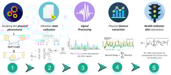 Flow diagram of the physics-based approach stages: (1) Study physical phenomena using dynamic models to analyze system response in healthy and faulty conditions; (2) Collect vibration data from the inspected machinery; (3) Apply signal processing techniques. (4) Extract meaningful physical features that emphasize faults; (5) Compute robust health indicators by combining extracted features.