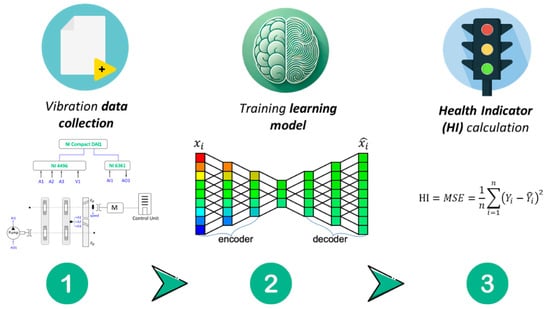 One example of data-driven is the use of an Auto-Encoder (AE) architecture. AE is a specialized neural network architecture used for dimensionality reduction and fault detection in REBs [,,,]. The AE consists of an encoder that compresses the input data into a lower-dimensional representation and a decoder that reconstructs the data. The key concept behind this method is training the AE using data from a healthy bearing state. Once trained, the AE will yield a low reconstruction error (RE) when processing healthy signals, while signals from faulty bearings will result in a larger RE due to differences in distribution. The reconstruction error serves as an effective HI, with a higher error indicating a potential fault. This approach provides an anomaly score that quantifies the deviation from the healthy state, making it a reliable indicator for bearing fault detection.