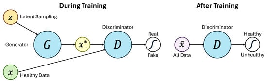 Another validation example is based on Generative Adversarial Networks (GANs). GANs have emerged as another data-driven method for bearing fault diagnosis, as demonstrated in Figure 3 []. The architecture consists of two neural networks: a Generator that produces signals similar to real data , and a Discriminator that distinguishes between real and generated signals. During training, the Discriminator learns to differentiate between healthy signals and those generated by the Generator. After training with healthy data, the Discriminator can be used to detect faults by comparing new signals to the healthy distribution. The HI derived from this process is calculated as , where represents the Discriminator’s confidence that a signal belongs to the healthy class. As the signal deviates from the healthy state, this HI increases, offering a robust indicator of potential faults.