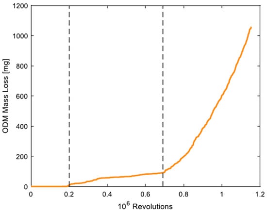 Mass loss versus revolutions, as presented in one of the experiments in []. The first vertical line represents the transition between the initiation and propagation phases, while the second vertical line estimates the transition from the steady-state to the accelerated stage.